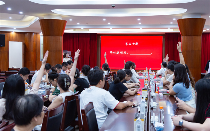 在古诗歌朗诵的深情演绎后,紧接着一个别开生面的趣味环节——“经典诗词接句”闪亮登场。这个环节巧妙结合了中秋思乡与国庆爱国的主题,将古诗词中的关键诗句进行挖空,职工们迅速抢答,补全被挖空的部分,让参与者们在轻松愉快的氛围中感受到中华文化的博大精深,并进一步加深对传统文化的热爱。